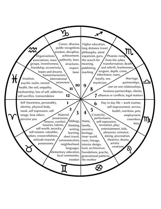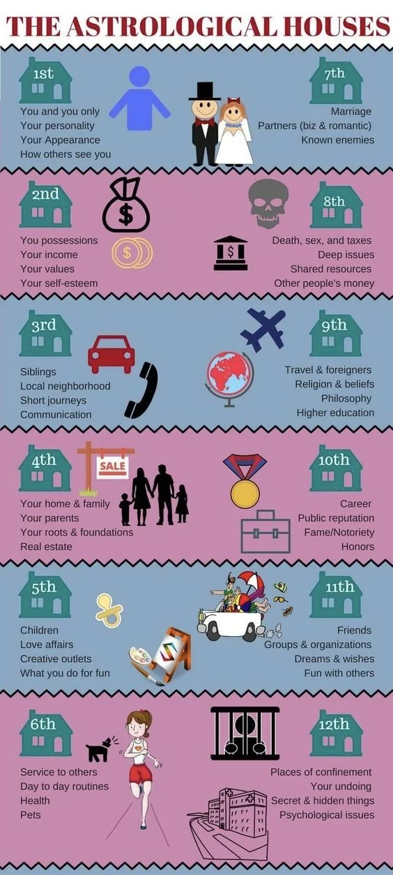Every horoscope is divided into twelve sections called houses, and the planets sit within them. Depending on when and where we are born we all have a different mix of planets in different houses. This creates a sort of “map” of our lives and gives great insight into who we are.